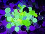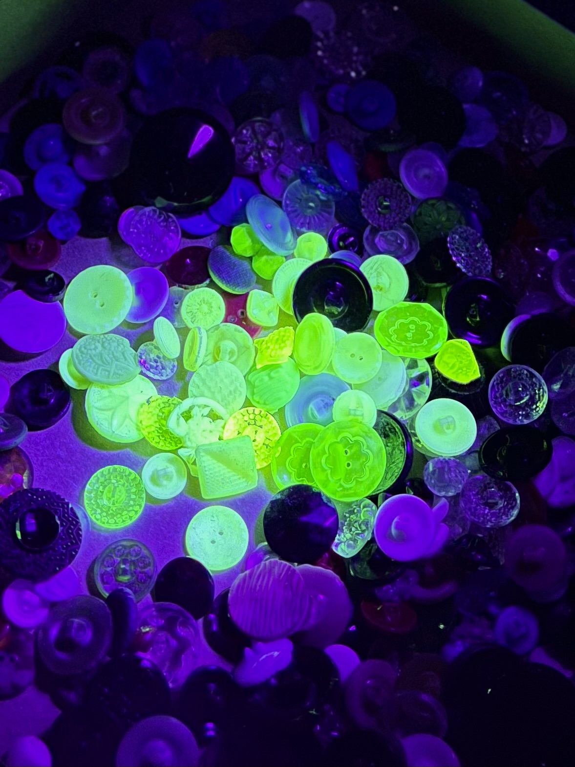 Knoflíky z uranového skla, nalezené v okolí skláren v Jablonci nad Nisou.